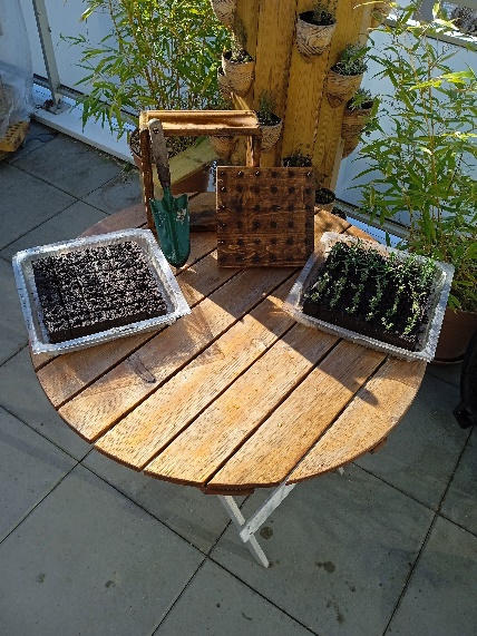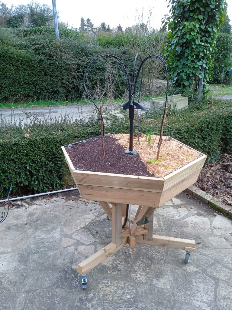 - 1 table de culture pour personnes à mobilité réduite. Montée sur roulettes, cette table peut être déplacée en accrochant la table à un fauteuil roulant motorisé. La table est munie d’un arrosage automatique.